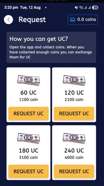 Show cards such as: 60 UC, 120 UC, 180 UC, 240 UC with the required points (e.g., 60 UC = 1100 coins, 120 UC = 2100 coins, etc.).