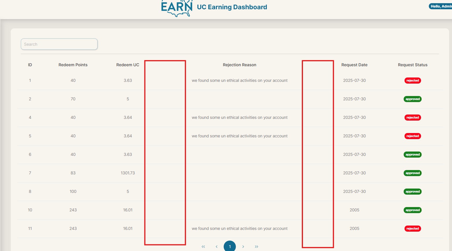 Please add a Redeem UC section like the screenshot (cards/tiers). Requirements: